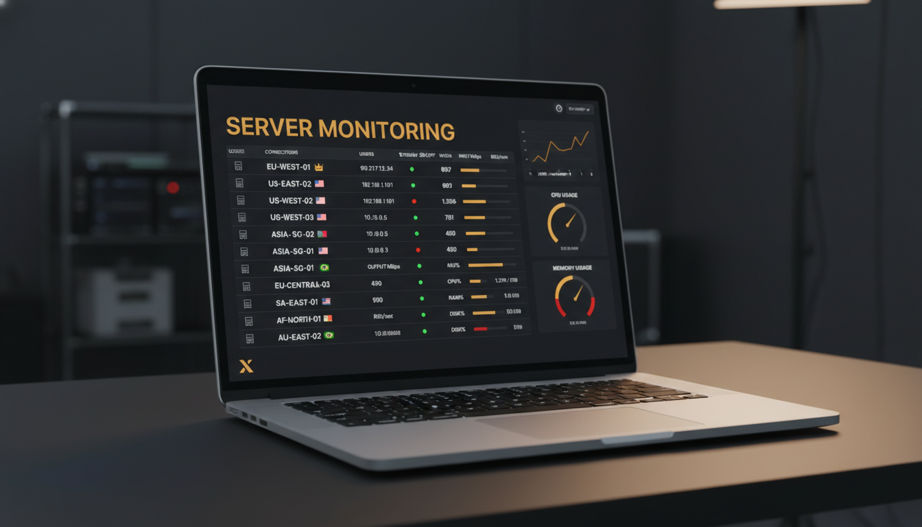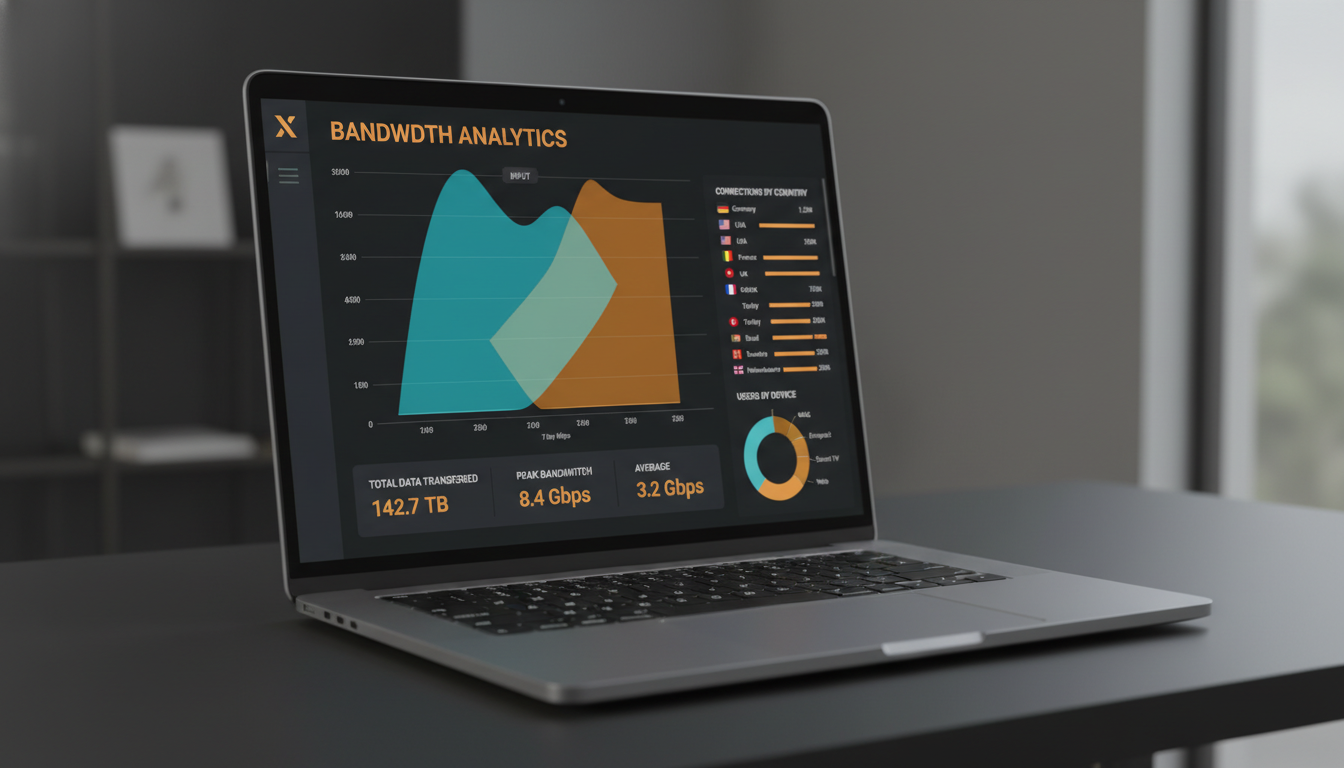 Monitor connections, bandwidth, geographic distribution, and server health live.